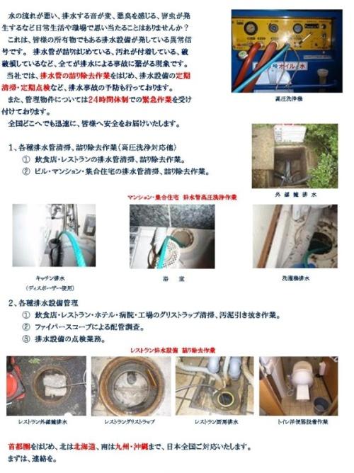 創業以来培ってきたリサイクル工場の操業経験を生かし、全国どこでも操業及び管理を 引き受けることが可能な体制を整えております。 2、排水設備管理 水の流れが悪い、排水する音が変、悪臭を感じる、害虫が発生するなど日常生活や職場で 思い当たることはありませんか? これは、皆様の所有物でもある排水設備が発している異常信号です。排水管が詰りはじめて いる、汚れが付着している、破損しているなど、全てが排水による事故につながる現象です。 当社では、排水管の詰り除去作業をはじめ、排水設備の定期清掃・定期点検など、排水事故の 予防を行っています。 また、管理物件については24時間体制での緊急作業を受け付けています。 全国どこでも迅速に、皆様へ安全をお届けします。 (1)各種排水管清掃、詰り除去作業(高圧洗浄対応他) 飲食店・レストランの排水管清掃、詰り除去作業。 ビル・マンション・集合住宅の排水管清掃、詰り除去作業。 (2)各種排水管設備管理 飲食店・レストラン・ホテル・病院・工場のグリストラップ清掃、汚泥引き抜き作業。 ファイバースコープによる配管調査。 排水設備の点検業務。 首都圏をはじめ、北は北海道、南は九州・沖縄まで、日本全国ご対応いたします。 まずは、連絡を。 グリーストラップ